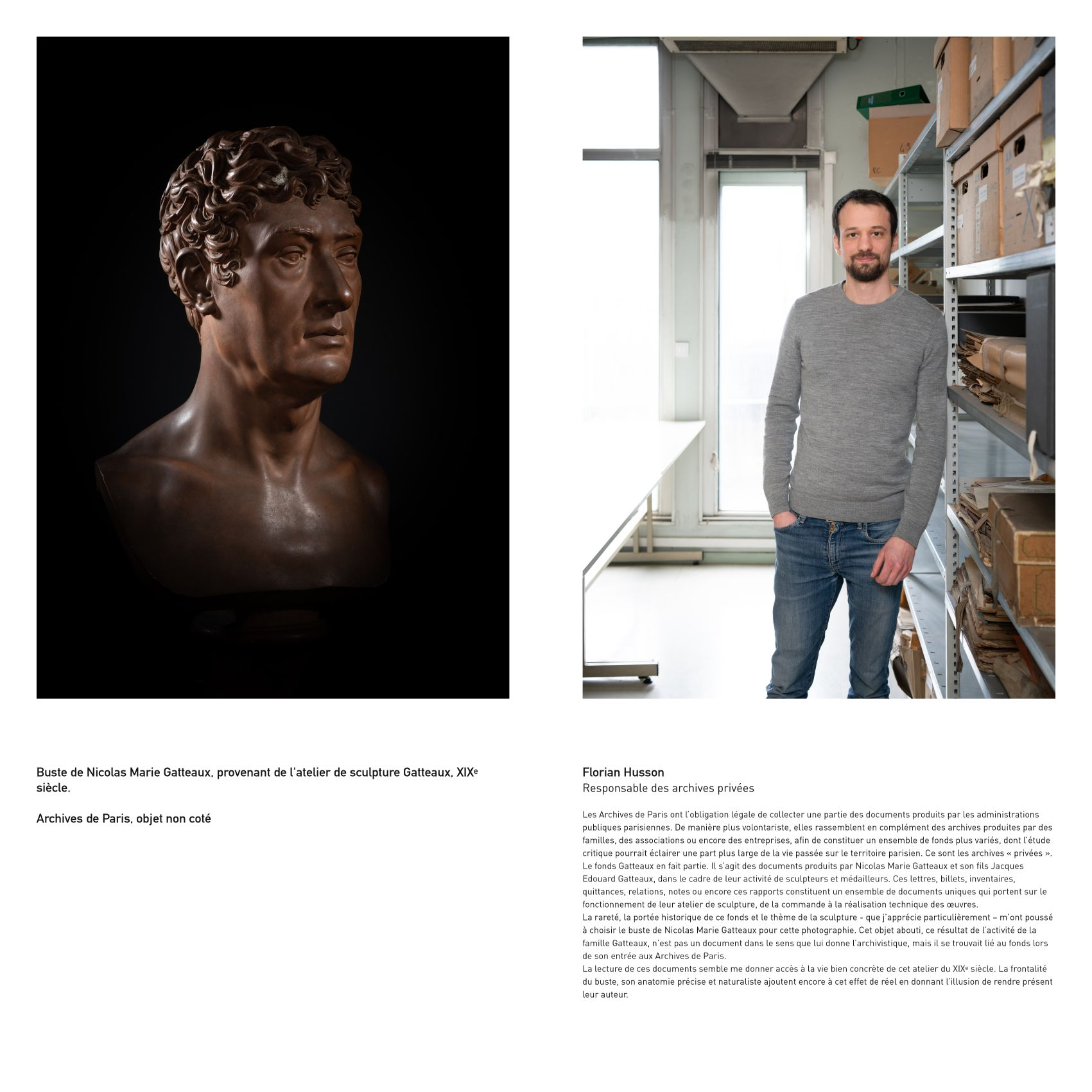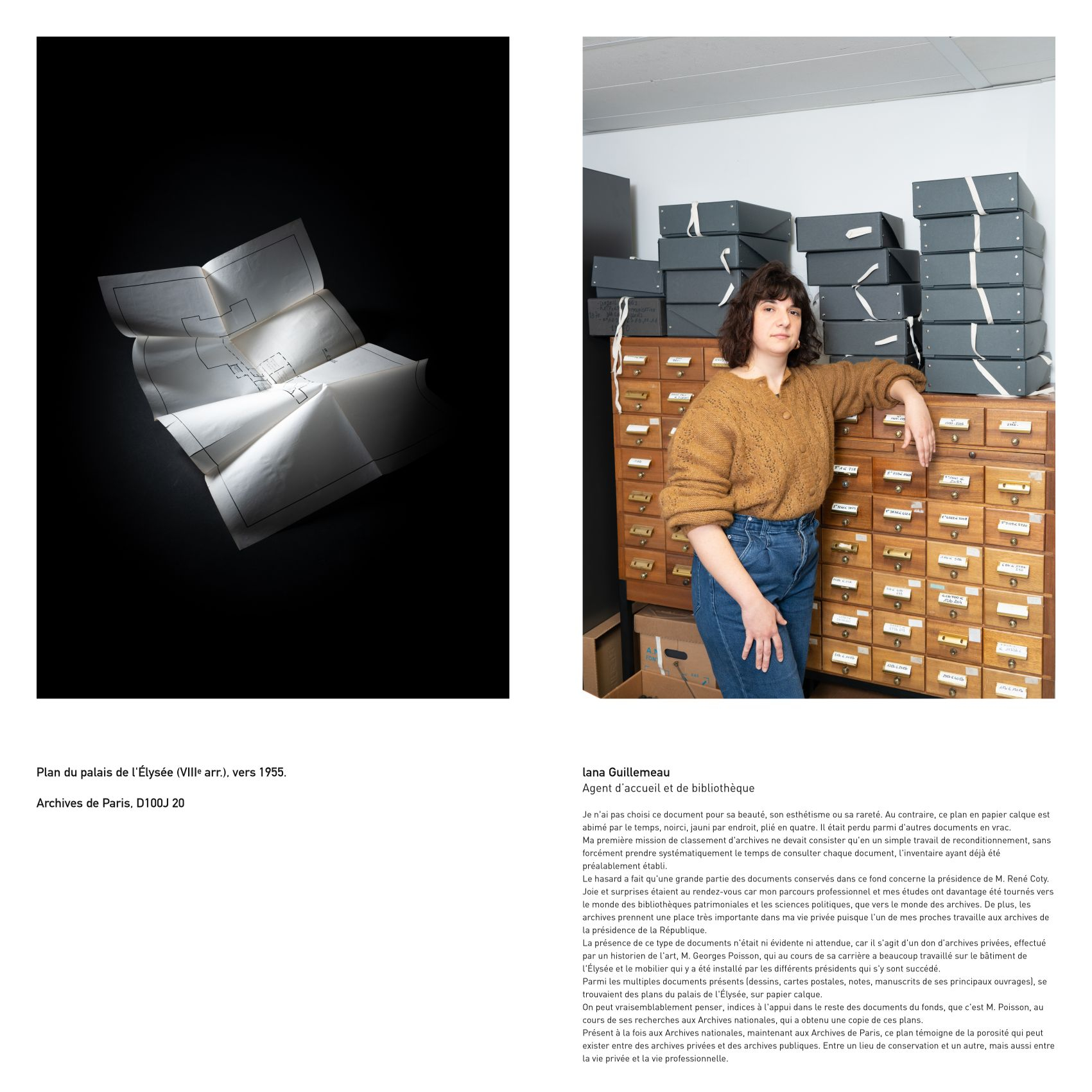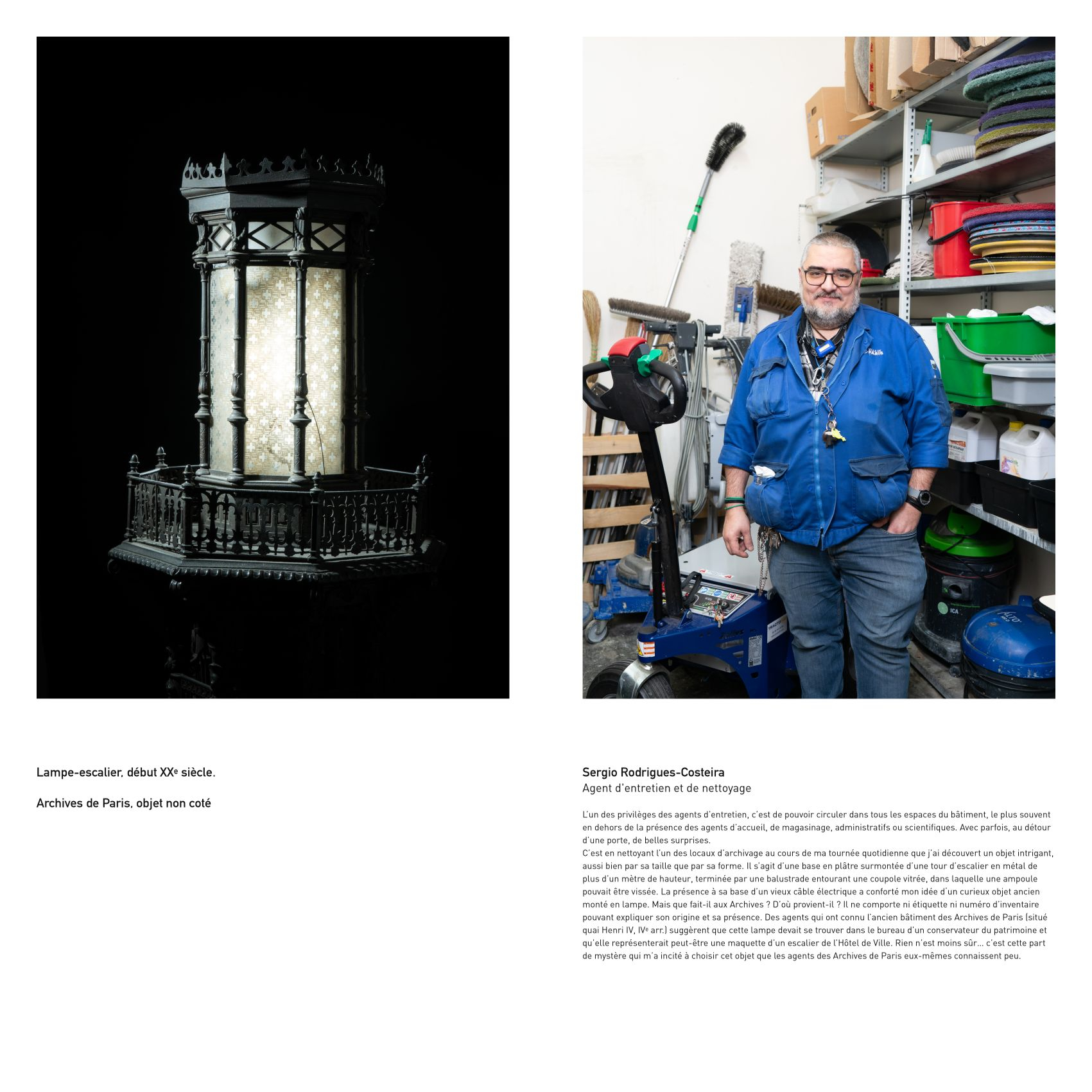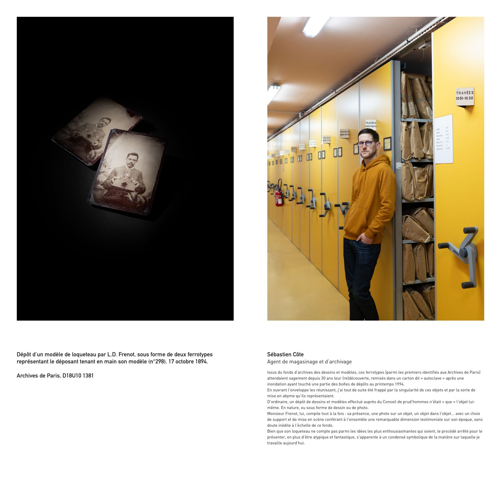 Intéressé par des problématiques sociales et institutionnelles, Eric Genevrier a choisi de faire le portrait d’agents des Archives de Paris associés à des documents ou objets conservés par cette institution.