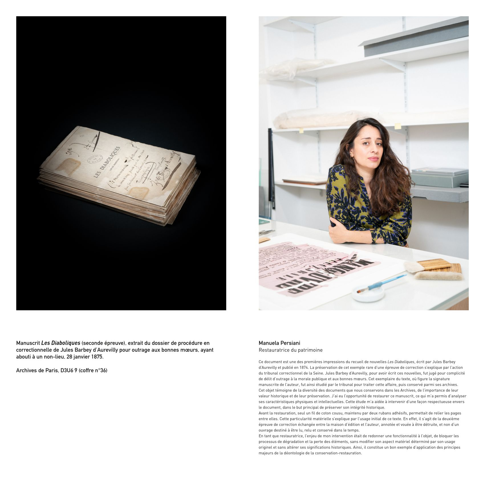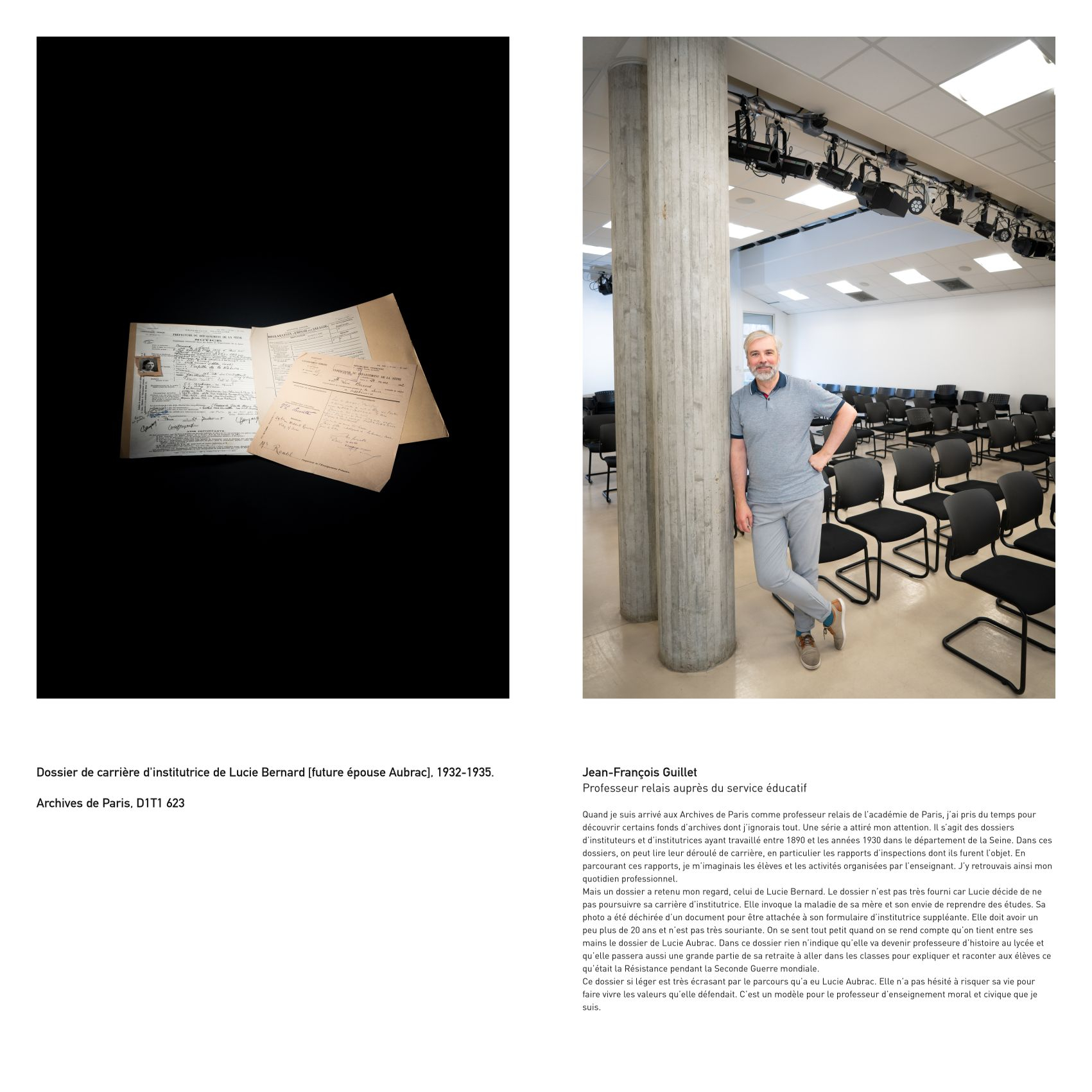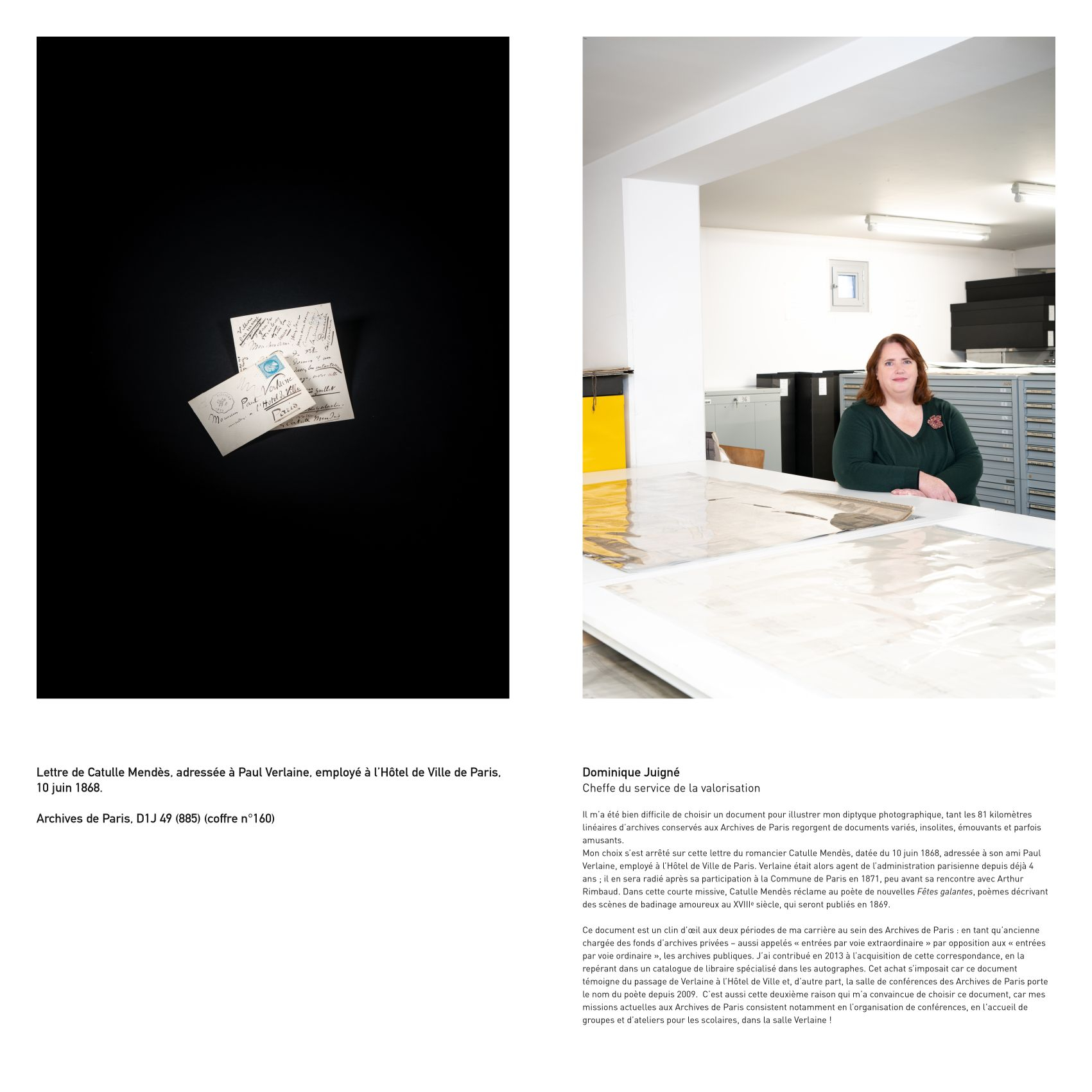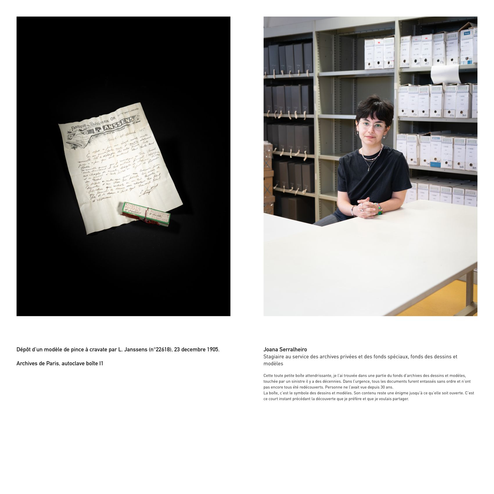 Intéressé par des problématiques sociales et institutionnelles, Eric Genevrier a choisi de faire le portrait d’agents des Archives de Paris associés à des documents ou objets conservés par cette institution.
